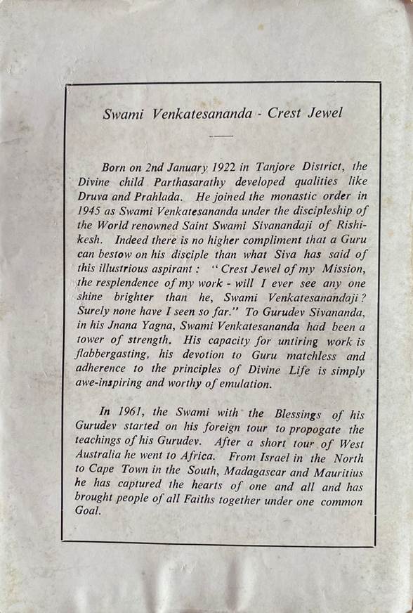 Sri Swami Venkatesanandaji, one of the foremost among the disciples of His Holiness SWAMI SIVANANDA Guru of hallowed memory, has brought in a new era of better under, standing, love and tolerance amongst various religions in South Africa, Israel, Mauritius ete. His great and noble work of bringing about an unprecedented awakening to the spiritual message of the holy Prophet-Founders of the great World Religions and an awareness of the essential unity underlying different faiths; is being hailed with gladness and gratitude by all in that part of the world. It is a matter of greatest pleasure for me therefore to write these words as a Foreword to this latest book of the revered Swamiji, which constitutes yet another contribution of his towards this task of reinterpreting ancient religion to modern man in his laudable work of bringing man closer to God.