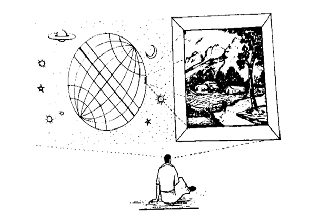 III ब्रह्मांड जिसमें 14 लोक (या विमान) शामिल हैं अर्थात (1) भू, (2) भुवः, (3) सुवः, (4) महः, (5) जनः, (6) तपः, (7) सत्य, (8) अतल, (9) वितल, (10) सुतल (11) तलातल। (12) महातल (13) रसातल और (14) पाताल। (पहले के सात उच्च क्षेत्र हैं और बाद के सात निम्न क्षेत्र हैं।) भोजन और अन्य भोग की वस्तुएं।