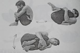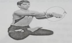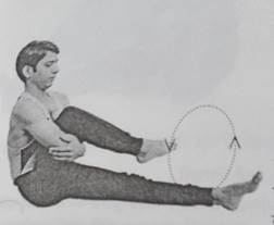 प्रारम्भिक स्थिति में बैठें। दर्शाए की भाँति दायीं टांग को घुटने पर मोड़ें। अपने हाथों को दायीं जांघ के नीचे रखे तथा अंगुलियों को भींच लें या कोहनियों को पकड़ कर बाजू एक दूसरे के ऊपर लेकर जायें। दायां पैर भूमि से ऊपर उठायें। टांग के निचले हिस्से को घुटने पर बड़े दायरे में गोलाकार घुमायें। शरीर का ऊपरी भाग और गर्दन पूरी तरह स्थिर रहें। अब बायीं टांग से पूरी प्रक्रिया दोहरायें। 5 से 10 बार घड़ी की सुईयों की सीधो और फिर विपरीत दिशा में घुमायें। इस आसन से जोड़ों में ऊर्जा का संचार से उन्हें नवजीवन प्राप्त होता है।