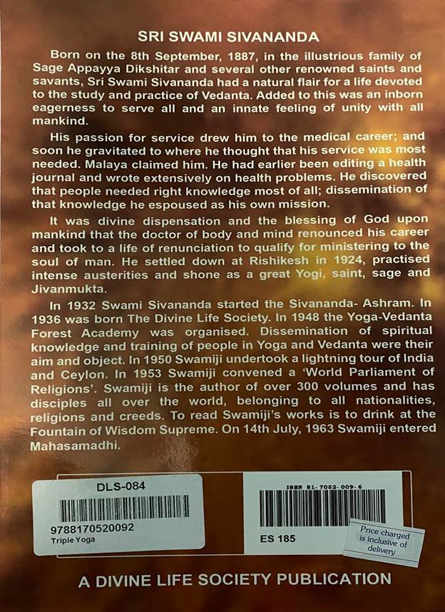 Each one has a particular preference for a particular course of Sadhana, and is at liberty to follow the path suited to his temperament. But if he is to achieve quick progress at all, on his chosen path, it is essential that he must take recourse to the help from the other systems. Triple Yoga, therefore, meets that need— providing the reader with an elementary knowledge of all the important branches of Yoga Sadhana.