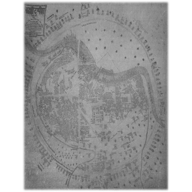 मानचित्र5: राजघाट पठार के साथ बनारस, जिसमें शुरुआती जल निकासी दिखाई गई है ।