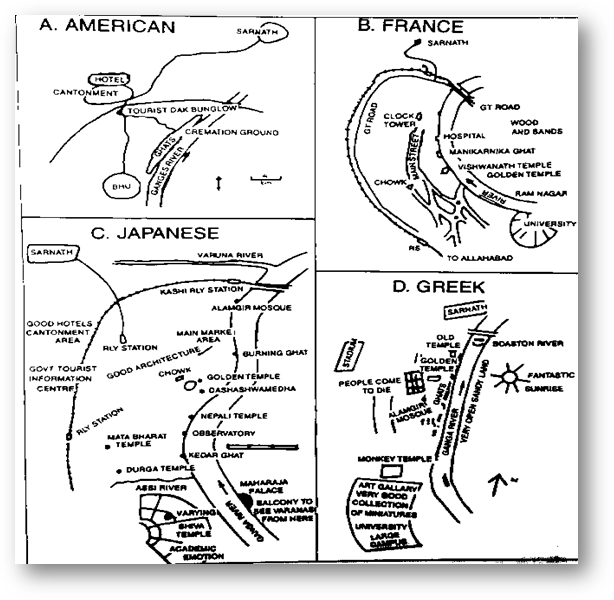 मानचित्र 2. वाराणसी के पर्यटकों के रेखाचित्र: अमेरिकी, फ्रांसीसी, जापानी और ग्रीक
