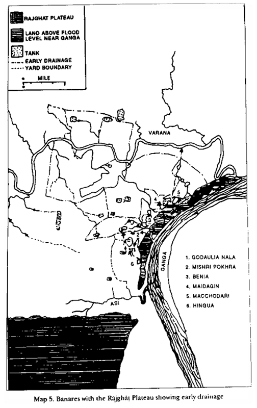 5. राजघाट पठार के साथ बनारस, जिसमें शुरुआती जल निकासी दिखाई गई है